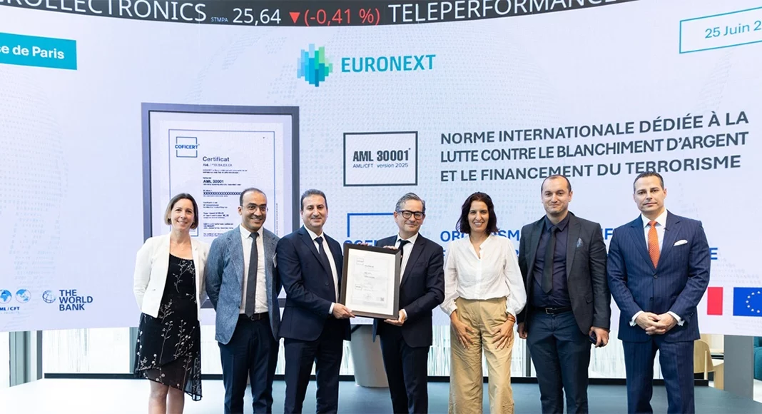 Tunisie Valeurs a été mise à l’honneur lors d’une cérémonie internationale organisée par COFICERT et l’IGSF, en collaboration avec EURONEXT, la principale bourse européenne (Paris, Amsterdam, Bruxelles, Dublin, Lisbonne, Milan, Oslo). L’institution a reçu la prestigieuse certification AML 30001® (version 2025), norme internationale dédiée à la lutte contre le blanchiment d’argent et le financement du terrorisme (LCB/FT).
