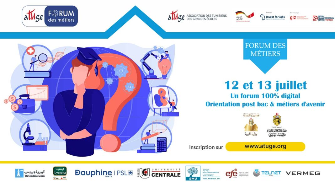 Les 12 et 13 juillet, l’ATUGE organise pour vous un Forum des Métiers et de l’orientation, 100% digital, que vous pourrez suivre où que vous soyez. Des panels sur les filières d’études, les métiers tendance dans le monde et en Tunisie, les scores et les alternatives…