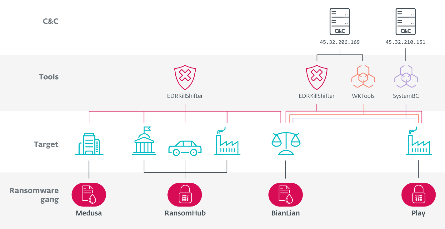 L’enquête d’ESET a également mis en évidence des liens entre les affiliés de RansomHub et d’autres groupes de ransomware actifs, tels que Play, Medusa et BianLian. Si une collaboration avec Medusa avait déjà été documentée, la présence d’EDRKillShifter dans des attaques attribuées à Play et BianLian suggère une collaboration plus étroite, potentiellement au niveau technique, organisationnel, ou même un partage d’infrastructures.