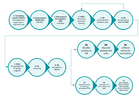 Le processus est aussi simple qu’efficace : dès qu’une activité suspecte est détectée, ESET PROTECT effectue une sauvegarde instantanée des fichiers sensibles. Si l’attaque par ransomware est confirmée, le processus malveillant est stoppé net et les données sont restaurées à partir des copies sécurisées. En cas de fausse alerte, la sauvegarde temporaire est automatiquement supprimée, assurant ainsi une protection sans perturber le fonctionnement normal de l’entreprise.