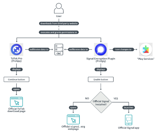 La campagne ProSpy, détectée pour la première fois en juin 2025, semble active depuis 2024. Elle repose sur trois sites web malveillants imitant les pages officielles de Signal et ToTok. Ces plateformes distribuent des fichiers APK frauduleux baptisés Signal Encryption Plugin et ToTok Pro, prétendant offrir des fonctionnalités de sécurité avancées.
