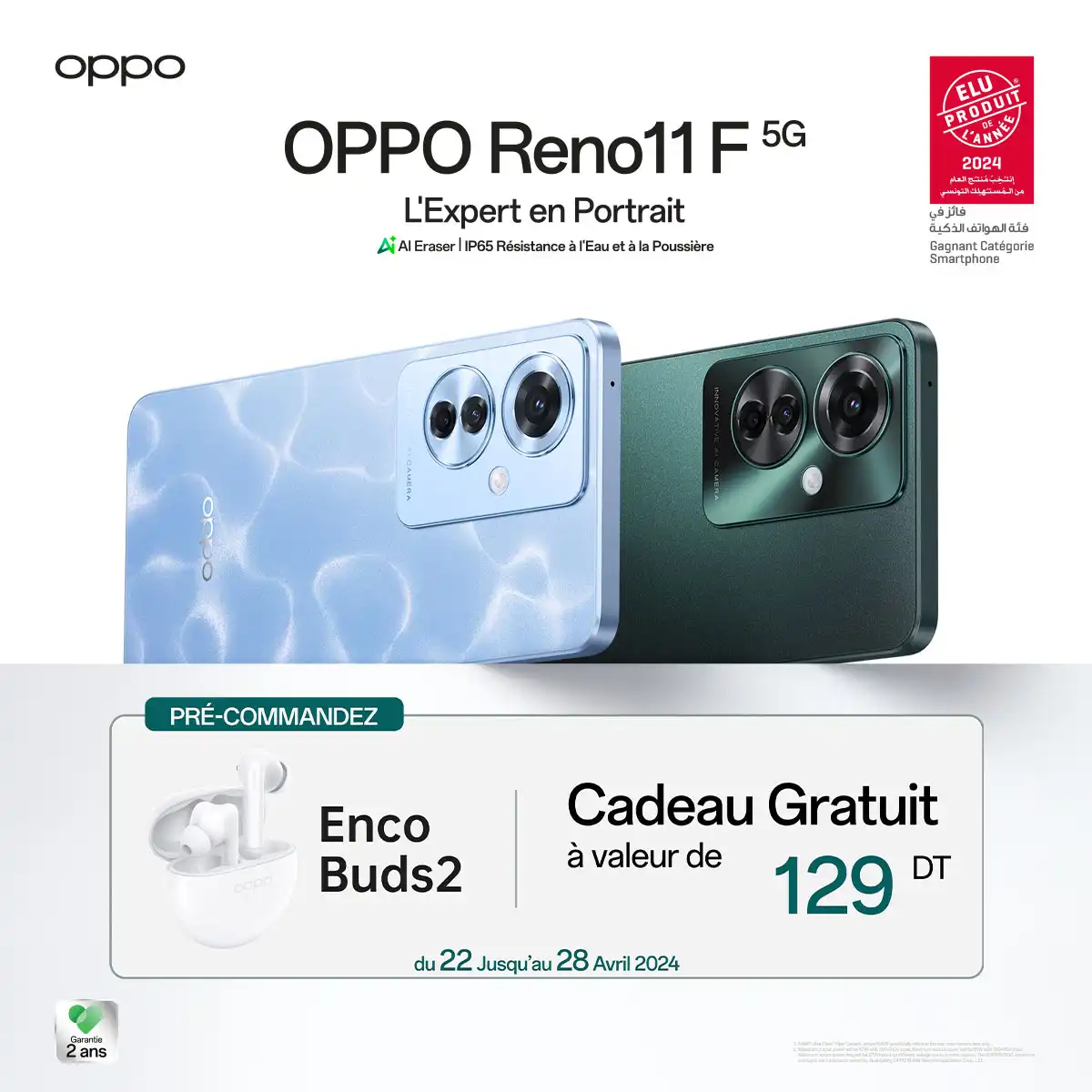 Ainsi, les fans des produits technologiques OPPO peuvent réserver leurs nouveaux appareils, Reno11 F 5G, en bénéficiant d’une gratuité sur les écouteurs sans fil, Enco Buds 2 (d’une valeur de 129 dinars).