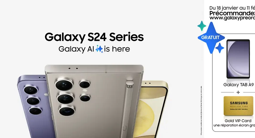 Les clients qui précommandent la nouvelle série Galaxy S24 bénéficieront d’une tablette Galaxy Tab A9 et une carte gold pour une réparation gratuite de l’écran valable une année.