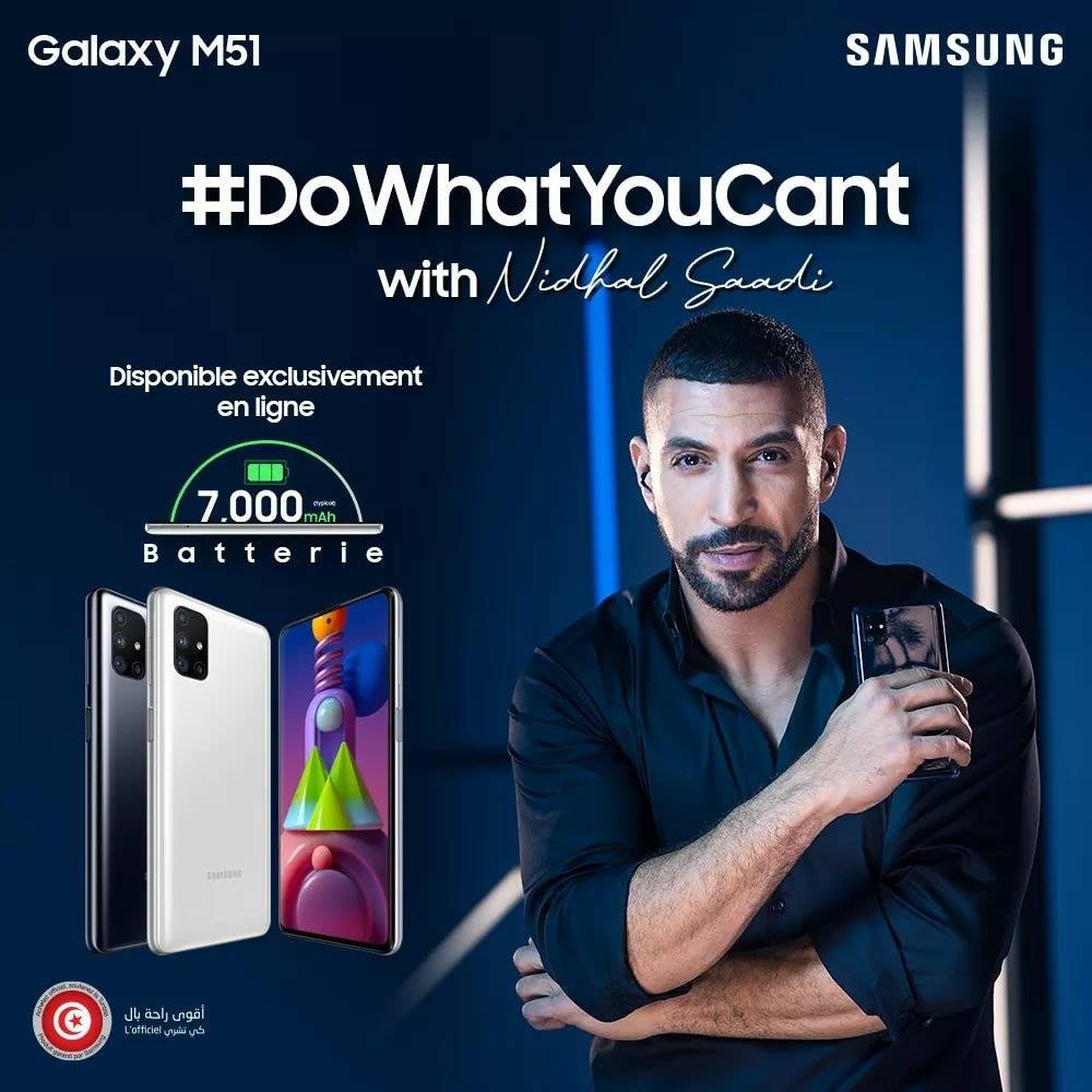 Samsung Tunisie choisit l’acteur tunisien Nidhal Saadi comme nouvel ambassadeur de la marque. La star tunisienne représentera la nouvelle campagne du Samsung Galaxy M51, le tout nouveau Smartphone dont les caractéristiques peuvent atteindre jusqu’à 24h de connectivité, 64h de communication, et 182h de musique.