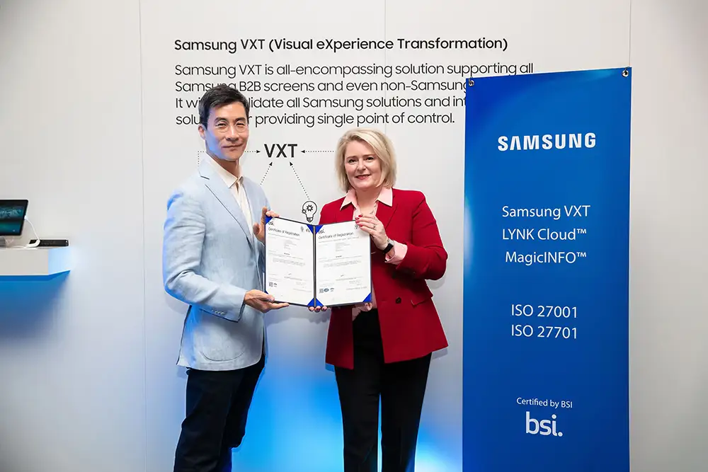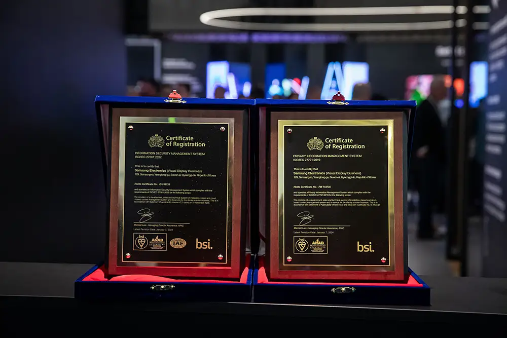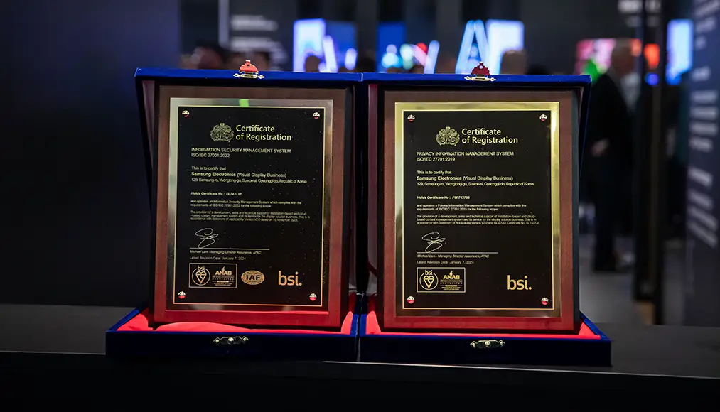 Samsung Electronics, numéro un mondial des fournisseurs d’affichage numérique depuis 14 années consécutives, a annoncé aujourd’hui avoir obtenu les certifications ISO/IEC 27001:2022 et ISO/IEC 27701:2019 de la British Standards Institution (BSI) pour ses systèmes de gestion de contenu d’affichage numérique (CMS). Les trois systèmes récompensés par ces certifications sont la plateforme Samsung Visual eXperience Transformation (VXT), MagicINFO™ et LYNK Cloud™.