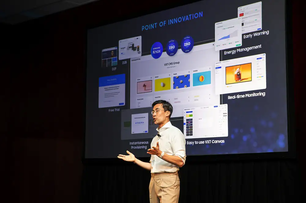 - Samsung VXT : un CMS cloud natif combinant la gestion de contenu et d’affichage à distance sur une seule plateforme sécurisée. Conçue dans un souci de facilité d’utilisation, la solution tout-en-un permet aux entreprises de créer et de gérer facilement leurs écrans numériques. Il rationalise les opérations avec configuration et récupération rapides, tout en offrant un déploiement facile, des économies de coûts et un temps d’arrêt minimal en cas de panne. Sa fonctionnalité VXT Canvas simplifie la création de contenu, la rendant plus intuitive et conviviale.