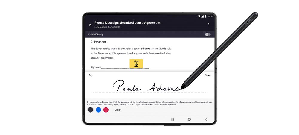 DocuSign, qui offre la solution de signature électronique leader au monde et est utilisé par 24 des 25 plus grandes sociétés financières du Fortune 500 a également été optimisé pour Android 12L. Le Galaxy Z Fold4 simplifie la signature d’accords sur de grands écrans. Les utilisateurs peuvent désormais rapidement faire glisser et déposer des pièces jointes d’e-mails en mode multi-vues directement dans DocuSign eSignature, sceller rapidement des accords lors de leurs déplacements avec le S Pen de Samsung et la signature Flex Mode dédiée.