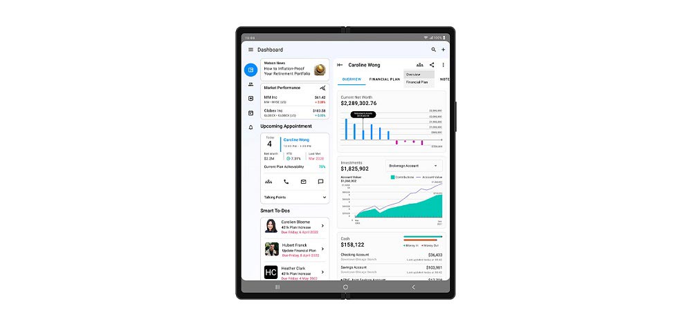 Samsung a également collaboré avec IBM pour relever les défis auxquels les professionnels de la finance peuvent être confrontés en aidant leurs clients tout en travaillant de n’importe où. IBM iX, le partenaire de conception d’expérience au sein d’IBM Consulting, a travaillé avec une institution financière de premier plan pour développer l’expérience mobile, aidant les conseillers en patrimoine à accéder et à gérer rapidement les informations sur les marchés et les portefeuilles. L’intégration de Samsung DeX et S Pen permet aux utilisateurs d’interagir avec les données, de glisser-déposer des fichiers entre les applications, de traduire l’écriture manuscrite en texte et même de capturer des signatures numériques dans un environnement de bureau complet sur leur appareil pliable. La philosophie d’ouverture de Samsung a également permis l’incorporation d’autres applications populaires pour la visioconférence, les contacts clients, les e-mails et les horaires dans une interface multi-applications.