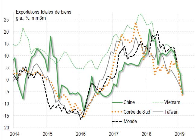 En Asie, les pays industrialisés font face à un important ralentissement de leur commerce extérieur. Les signes d’affaiblissement, visibles dès début 2018, se sont aggravés depuis novembre, suite à la dernière vague d’augmentation des droits de douane américains sur les importations de biens venus de Chine. Les exportateurs asiatiques ont de fait été sévèrement touchés par les effets de contagion de ces hausses, ainsi que par le ralentissement économique des principaux partenaires commerciaux et par le retournement du cycle électronique mondial.