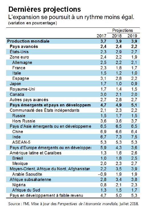 La croissance reste généralement vigoureuse dans les pays avancés, mais elle ralentit dans beaucoup d’entre eux, notamment dans des pays de la zone euro, au Japon et au Royaume-Uni. Par contre, la croissance du PIB continue d’être plus élevée que le potentiel et la création d’emplois reste robuste aux États-Unis, grâce dans une large mesure aux baisses récentes des impôts et à l’augmentation des dépenses publiques. Cependant, même la croissance américaine devrait ralentir au cours des prochaines années tandis que la longue reprise cyclique fait son temps et que les effets de la relance budgétaire temporaire s’estompent. Pour les pays avancés, nous prévoyons une croissance de 2,4 % en 2018, soit 0,1 point de pourcentage de moins que notre projection des Perspectives de l’économie mondiale d’avril dernier. Nous maintenons une prévision de croissance inchangée de 2,2 % dans ces pays pour 2019.