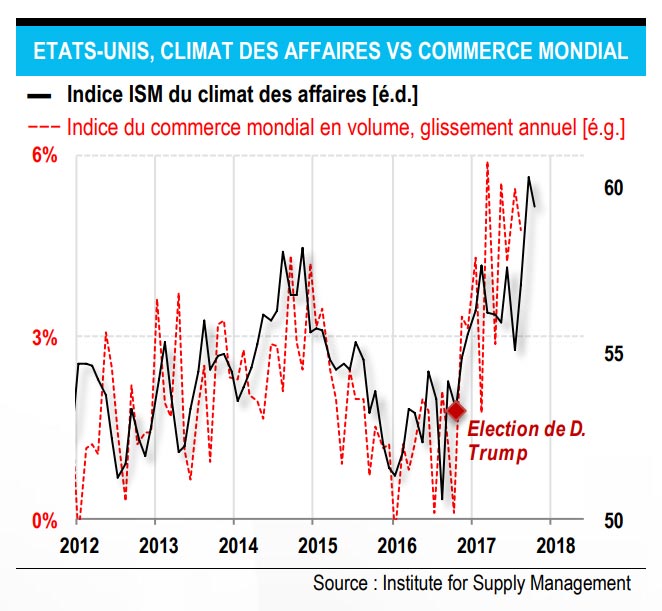 Les ressorts de l’embellie sont ailleurs, par exemple en Chine. En y relançant dès le printemps 2016 la machine économique, son président Xi Jinping a beaucoup fait pour stabiliser le commerce mondial (la Chine en assure à elle seule 15%). Les banques centrales européenne et britannique ont aussi joué un rôle, elles qui, l’an passé, ont significativement augmenté leurs apports en liquidités. Le rebond des cours mondiaux du pétrole a enfin pu aider les producteurs américains, les activités de forage ayant repris aux Etats-Unis bien avant l’élection de M. Trump. Lorsque celle-ci est intervenue, le climat économique était déjà plus favorable, les échanges mondiaux redémarraient (c.f. graphique). Une chance paradoxale pour le promoteur de l’« America First »