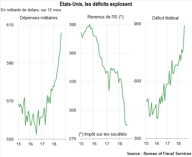 Baisses historiques d’impôts, hausses des dépenses militaires, transferts aux agriculteurs, premières victimes collatérales de l’affrontement commercial avec la Chine : à l’approche des élections de mi-mandat, tout est mis en œuvre par l’Administration Trump afin de soutenir la conjoncture. Quitte à faire exploser le déficit fédéral, dont la hausse est l’une des plus fortes jamais enregistrée hors période de récession.