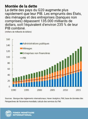Il y a par ailleurs la montée des niveaux d’endettement dans les principaux pays de la planète. Les emprunts des États, des ménages et des entreprises (banques non comprises) dans les pays du G20 dépassent 135.000 milliards de dollars, soit l’équivalent d’environ 235 % de leur produit intérieur brut combiné. Malgré le faible niveau des taux d’intérêt, le poids du service de la dette s’est alourdi dans plusieurs pays. L’emprunt a certes contribué à la reprise mais il a aussi créé de nouveaux risques financiers. Par exemple, le chapitre 2 du Rapport sur la stabilité financière dans le monde montre que la croissance de la dette des ménages par rapport au PIB est liée à une plus grande probabilité de crise bancaire.