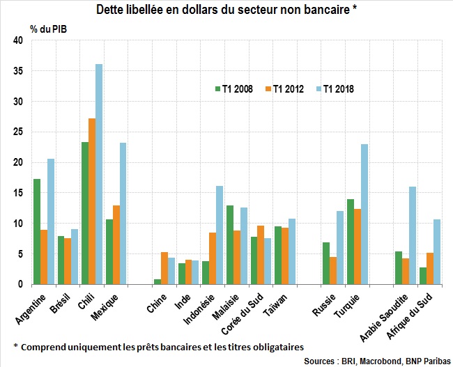Les emprunteurs émergents ont donc largement profité du contexte mondial de liquidité abondante et de taux US faibles des années qui ont suivi la crise de 2008. Certains pays, au-devant desquels la Turquie, l’Argentine, le Chili, l’Afrique du Sud et l’Indonésie, affichaient les ratios d’endettement en dollars les plus dégradés à la fin du premier trimestre 2018 – soulignant leur forte vulnérabilité au resserrement de la politique monétaire américaine et à l’actuel mouvement de dépréciation de leurs monnaies.
