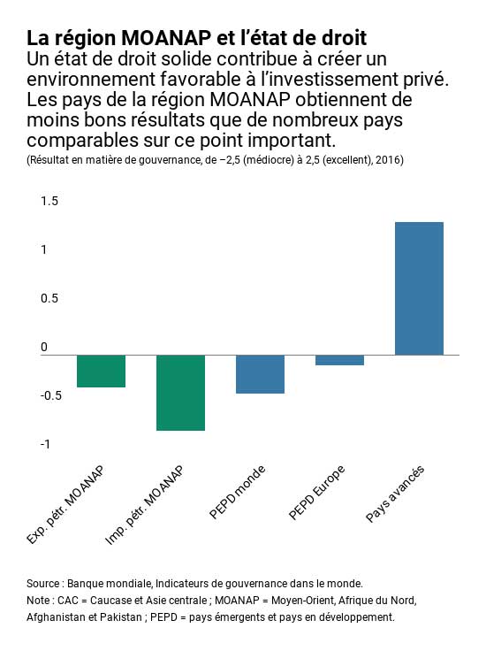 Les pays importateurs de pétrole accusent aussi un retard sur les pays comparables selon plusieurs indicateurs de gouvernance, de la corruption à l’état de droit. Une amélioration de l’état de droit, jusqu’à atteindre la moyenne des pays émergents et pays en développement, pourrait augmenter l’investissement privé de deux tiers de point de pourcentage du PIB. Parallèlement, porter le niveau de développement financier des pays importateurs de pétrole de la région MOANAP à celui des pays européens émergents pourrait accroître l’investissement privé de ½ point de pourcentage du PIB.