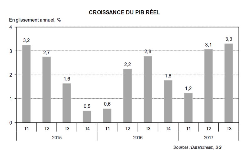La bonne tenue du marché du travail et de la confiance des ménages devraient favoriser la consommation en 2018, mais leur taux d’épargne, au plus bas depuis dix ans, risque de remonter et d’en limiter la progression. L’expansion mondiale synchronisée devrait doper les exportations et les profits des entreprises.