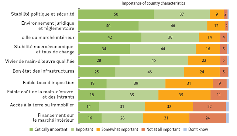 L’enquête révèle que la stabilité politique, la sécurité et un environnement juridique et réglementaire prévisible font partie des caractéristiques décisives des choix des multinationales au moment d’engager des fonds dans un nouvel investissement, et que ces aspects sont des facteurs autrement plus déterminants qu’une fiscalité avantageuse ou une main-d’œuvre bon marché.