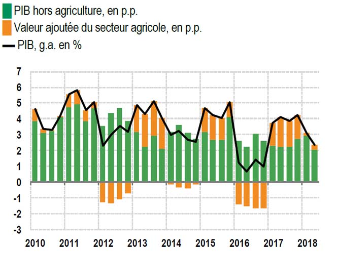 Avec une croissance de seulement de 2,4% au T2 contre 3,2% au trimestre précédent et une moyenne de 4,1% en 2017, la dynamique de l’économie marocaine tend à s’essouffler. La décélération de l’activité agricole à 3% était attendue après une très bonne performance en 2017 (+13%). En revanche, celle des secteurs non agricoles a de quoi surprendre. A 2,6%, la croissance du PIB hors agriculture décroche de 1 point au T2 par rapport au premier trimestre mais surtout retrouve un niveau qu’elle n’avait plus connu depuis le T2 2016.