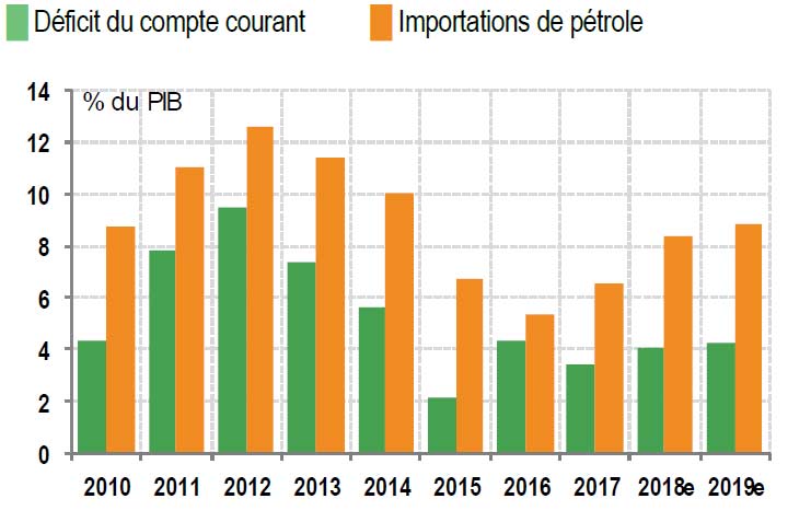 L’inflation a accéléré sous le double effet du renchérissement des produits alimentaires et des carburants. Mais le pic semble avoir été atteint. Le taux d’inflation est revenu à 1,7% en août contre une moyenne de 2,4% lors du premier semestre grâce à une atténuation assez nette de la hausse des prix alimentaires. Avec une inflation sous-jacente stable, à 1,2%, le risque inflationniste semble contenu, ce qui devrait permettre à la banque centrale de maintenir son taux directeur à un niveau bas. Il est à 2,25% depuis mars 2016. Sur les huit premiers mois de l’année, le déficit commercial s’est creusé de 10% sous l’effet du gonflement de la facture énergétique (+19%) et des achats de biens d’équipement (+12%). Ces deux postes représentent 40% des importations. Or, avec des prix du pétrole qui devraient rester élevés en 2019 et la poursuite des grands projets industriels, la pression va rester forte à court terme. Malgré la bonne tenue des recettes touristiques (15% des recettes courantes) et le lancement en 2019 d’une nouvelle unité de production automobile, désormais principale source d’exportations (24% en 2017), le déficit courant devrait ainsi repasser au-dessus des 4% du PIB, au moins sur les deux prochaines années, contre 3,4% en 2017.