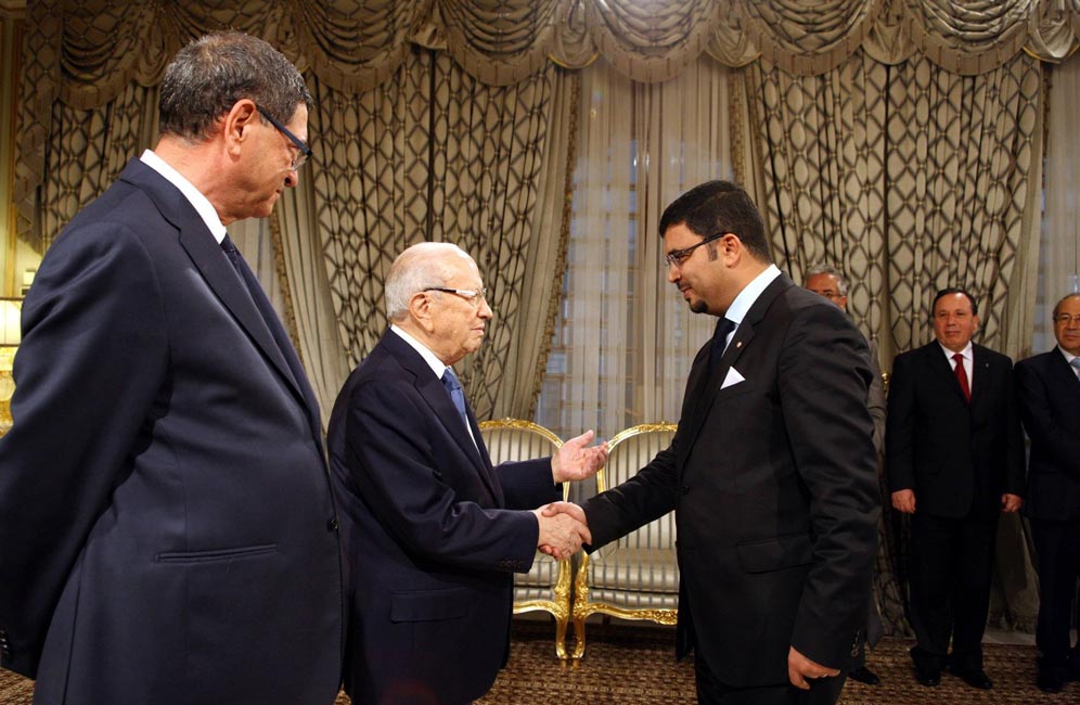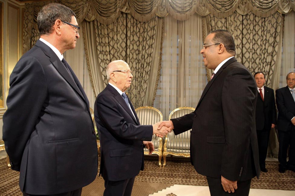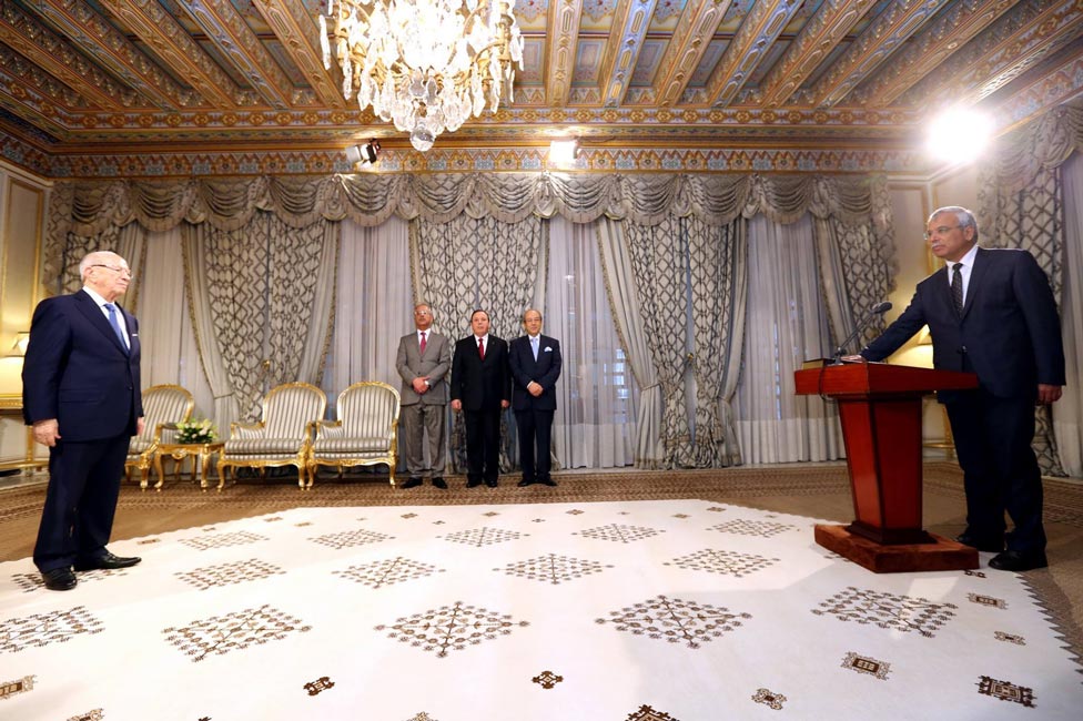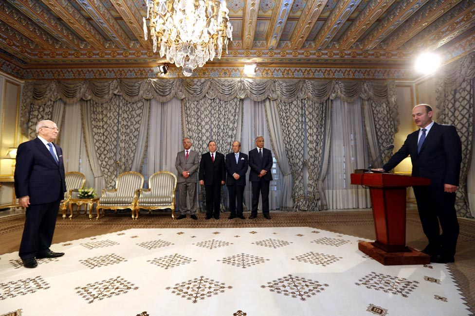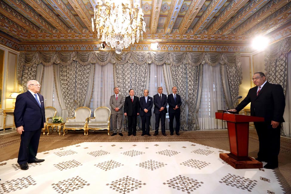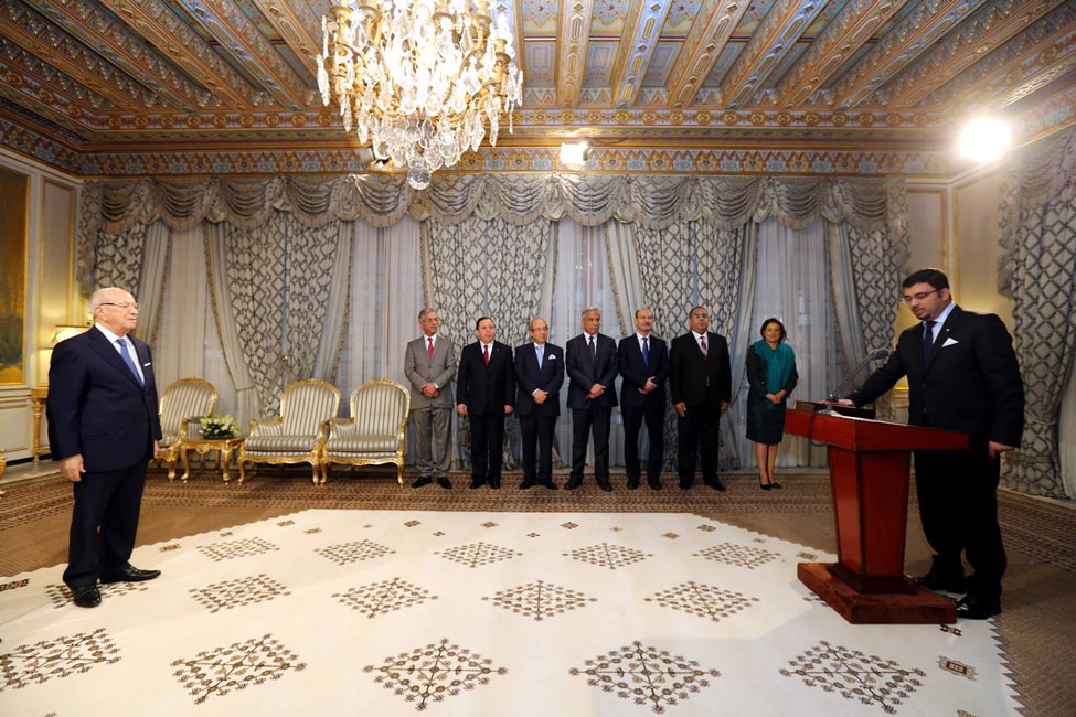 أشرف رئيس الجمهورية الباجي قايد السبسي صباح اليوم الثلاثاء 12 جانفي 2016 بقصر بقرطاج على موكب أدى خلاله أعضاء الحكومة الجدد اليمين الدستورية، وذلك بحضور رئيس الحكومة الحبيب الصيد، وهم:- عمر منصور: وزير العدل- خميس الجهيناوي: وزير الشؤون الخارجية- محمد خليل: وزير الشؤون الدينية- كمال العيادي: وزير الوظيفة العمومية والحوكمة ومكافحة الفساد- منجي مرزوق: وزير الطاقة والمناجم- محسن حسن: وزير التجارة- سنية مبارك: وزيرة الثقافة والمحافظة على التراث- خالد شوكات: وزير لدى رئيس الحكومة مكلف بالعلاقة مع مجلس نواب الشعب والناطق الرسمي بإسم الحكومة.
