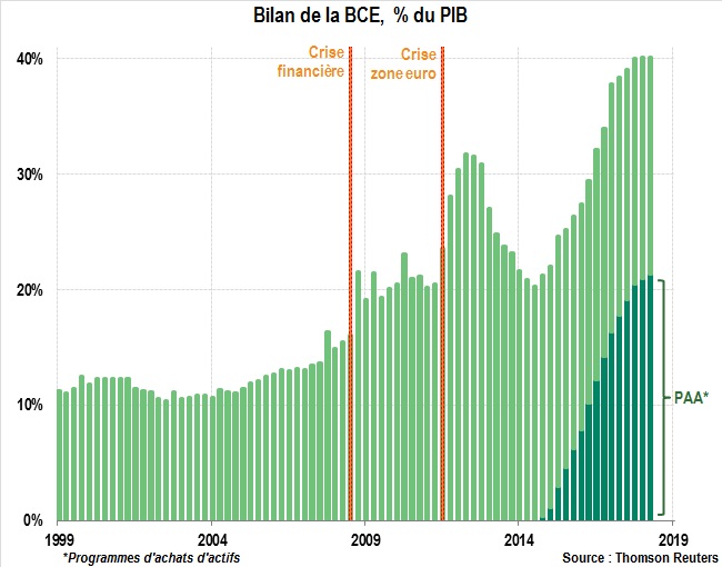 Le 1er janvier 2015, ce qui semblait impensable d’un point de vue allemand est advenu, la Banque centrale achetant en grande quantité des titres de la dette publique en zone euro. Elle en possède aujourd’hui 20%, le total de son bilan atteignant quarante points de PIB. Fin 2018, la BCE devrait mettre fin à son programme d’achats d’actifs, après avoir remis la zone euro sur pied. Un bilan somme toute impressionnant pour une institution de seulement vingt ans.