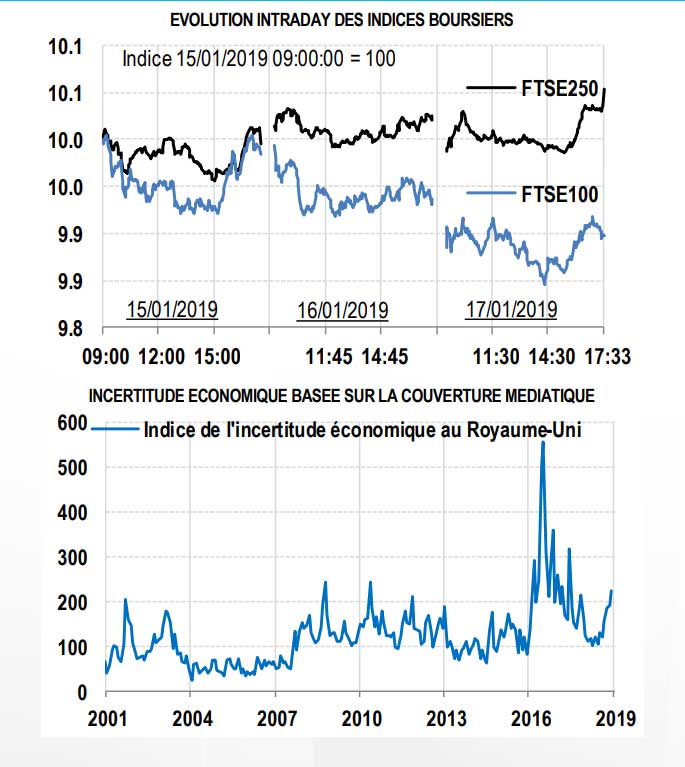 À en juger par la réaction des marchés actions, au lendemain de la sévère défaite essuyée par la Première ministre, Theresa May, lors du vote au Parlement britannique sur l’accord de Brexit, il semble que, du point de vue des investisseurs, la probabilité est désormais moins forte de devoir affronter un Brexit « dur » sans accord (sans période de transition). Cette interprétation se fonde sur la sous-performance du FTSE 100, tourné vers les marchés étrangers, par rapport à l’indice FTSE 250 davantage exposé au marché intérieur. Les marchés sont ainsi un peu moins préoccupés par l’impact économique d’un retrait de l’UE sans accord. Selon la Banque d’Angleterre, l’impact sur le niveau du PIB réel, à l’horizon 2023, d’une sortie sans accord pourrait être de l’ordre de 4,75 % à 7,75 %. Certes, ces estimations sont entourées d’un degré d’incertitude élevé, mais on peut supposer que l’impact serait considérable et concentré sur le début de la période, avec une chute de la confiance devant l’envolée de l’incertitude sur la manière dont les entreprises feront face à la perturbation des chaînes d’approvisionnement, un pouvoir d’achat des ménages impacté par la hausse de l’inflation suite à l’introduction de droits de douane et du repli de la livre sterling.