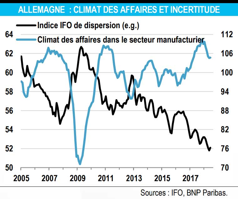 De manière générale, les indicateurs conjoncturels allemands se sont repliés depuis début 2018, Tout récemment, certains se sont stabilisés, l’incertitude des chefs d’entreprise, mesurée par la dispersion des évaluations des perspectives économiques, n’a pourtant pas augmenté malgré les craintes d’une guerre commerciale, La dispersion a tendance à présenter un décalage par rapport à l’évolution globale du climat des affaires. Cet indicateur devra donc être surveillé de près dans les prochains mois.