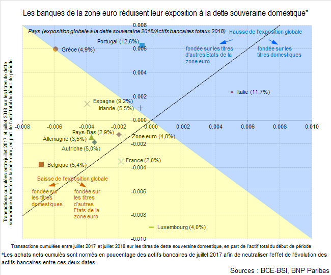 A l’exception des systèmes bancaires italien et portugais, les systèmes bancaires des principaux pays de la zone euro ont réduit leur exposition à la dette publique entre juillet 2017 et juillet 2018. L’exposition globale du système bancaire de l’ensemble de la zone euro s’est ainsi repliée de 5,1% des actifs bancaires à 4,8%.