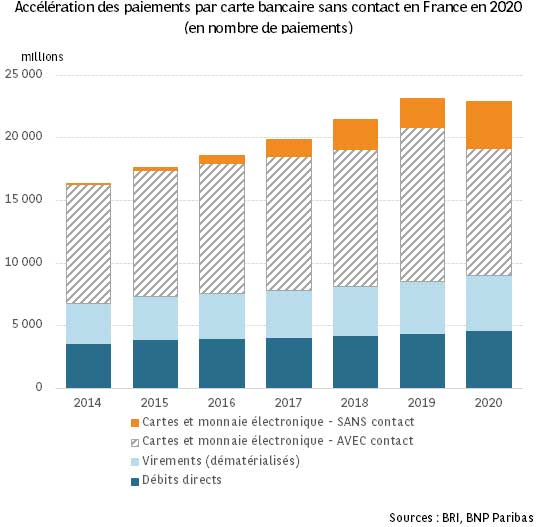 En outre, afin d’élargir le périmètre des opérations éligibles à ce mode de paiement dans le contexte de la pandémie, le plafond a été relevé de EUR 30 à EUR 50. Ainsi près de 60% des transactions réalisées en magasin, d’un montant inférieur à EUR 50, ont été réglées par carte bancaire sans contact en 2020, pour un montant cumulé de EUR 71 mds (contre EUR 38 mds en 2019) selon le Groupement des cartes bancaires.