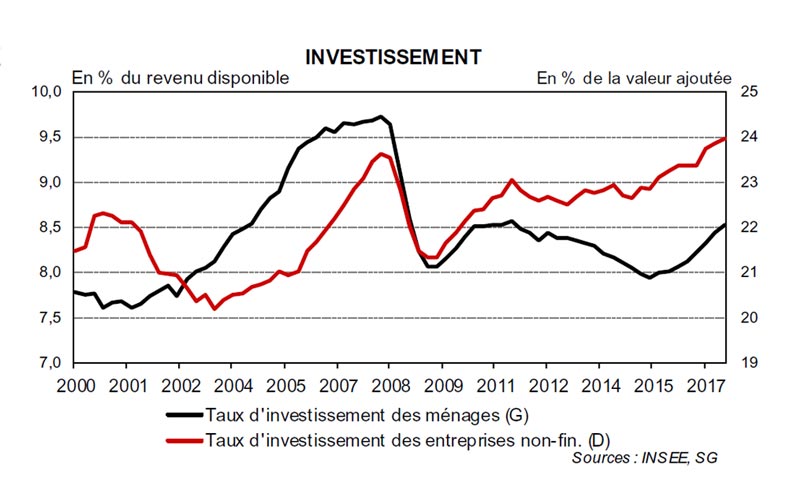 L’investissement resterait bien orienté mais perdrait progressivement de son dynamisme. En particulier, l’effort d’investissement des entreprises est déjà historiquement élevé et cesserait de se renforcer dans un contexte d’endettement déjà élevé et de légère remontée des taux d’intérêt. L’investissement des ménages croîtrait plus modestement après avoir opéré, en 2016 et 2017, un net mouvement de rattrapage.