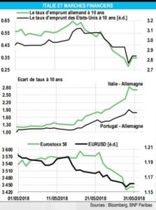 Au cours de la correction, les marchés ont de plus en plus intégré dans les prix des scénarios extrêmes. De nouvelles élections auraient signifié davantage de scénarios à évaluer, moins extrêmes cette fois. Comme l’écart de taux est la moyenne pondérée en fonction des probabilités des différents scénarios, la multiplication des scénarios peut contribuer à calmer les choses. La nouvelle publiée mercredi 30 mai, selon laquelle de nouveaux efforts allaient être engagés pour former une coalition, a suscité une vague de soulagement, le spread BTP-Bund se comprimant de 40 points de base : les marchés ou l’art du flipper ! La nomination jeudi 31 mai de Giuseppe Conte, pour prendre la tête d’un nouveau gouvernement, devrait apaiser les esprits. Il a, en effet, insisté lors d’une interview sur l’absence de la mention d’une sortie de l’euro dans l’accord de coalition.