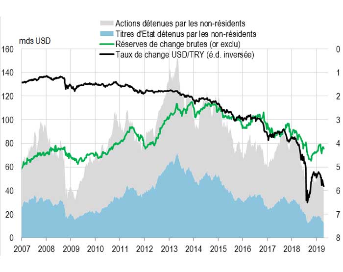 Après une chute vertigineuse de 42% par rapport à la moyenne euro-dollar entre janvier et août 2018, dont la moitié sur le seul mois d’août, la livre turque (TRY) a rebondi de 15% entre septembre et décembre, dans le sillage de la hausse massive des taux d’intérêt par la banque centrale (CBRT). Mais elle s’est de nouveau dépréciée de 10% au cours des deux derniers mois, sur fond de stagflation.