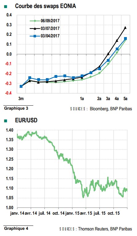 Le graphique 2 montre clairement que le spread n’a guère évolué depuis la mi-avril. De même, la courbe des swaps Eonia (graphique 3), qui permet de déterminer le niveau auquel le marché prévoit que se situera l’Eonia l’année prochaine et audelà, n’a pas non plus beaucoup évolué. En revanche, aux Etats-Unis, le swap OIS, indicateur des attentes en termes du taux des federal funds, a légèrement monté entre avril et septembre. En outre, l’écart à dix ans s’est resserré ce qui a soutenu l’euro. Il pourrait refléter une réévaluation favorable des perspectives de croissance en zone euro comparé aux Etats Unis