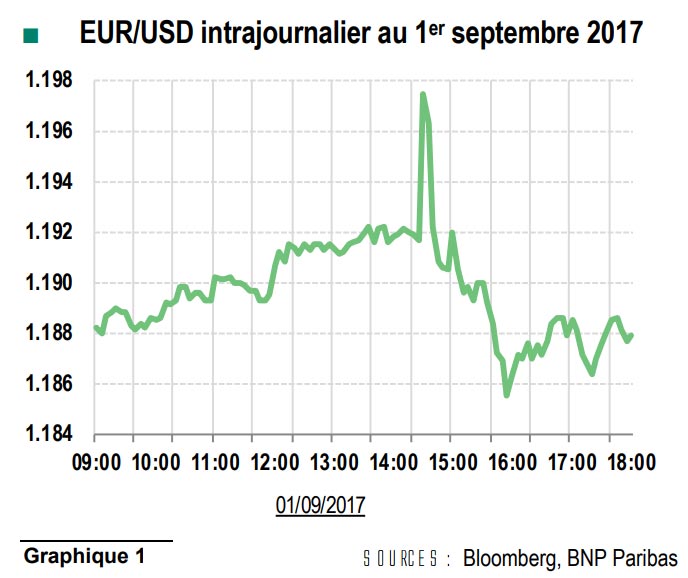 prévu sur le marché du travail américain, le bond de la parité EUR/USD a été de très courte durée (graphique 1). Il se peut que d’autres facteurs aient pesé sur l’euro tels que les rumeurs selon lesquelles la BCE s’apprêterait à reporter l’annonce de sa décision sur l’assouplissement quantitatif jusqu’à la réunion de décembre (si tel était le cas, cela pourrait atténuer le rally de l’euro). Plus généralement, cela reflète peut-être simplement la nervosité croissante des investisseurs qui s’interrogent sur l’orientation du marché.