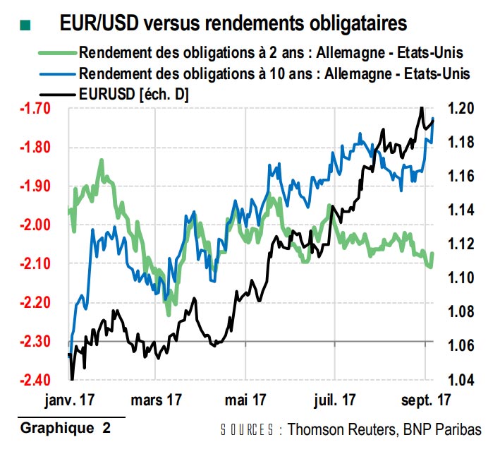 Dans la pratique, les investisseurs s’intéresseront à la variation attendue du différentiel de taux d’intérêt réels, si bien que le pays qui offre un taux d’intérêt réel plus bas peut tout de même voir sa monnaie s’apprécier si ce différentiel est appelé à se resserrer. Historiquement, les écarts de taux d’intérêt nominaux observés expliquent souvent en grande partie les variations de change de sorte que si l’on s’intéresse au graphique EUR/USD de manière isolée, on peut être tenté d’en conclure que l’appréciation de l’euro est due à un resserrement des spreads de taux d’intérêt encore négatifs entre la zone Euro et les ÉtatsUnis.