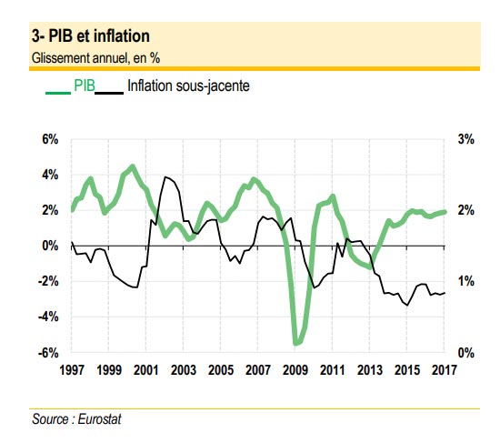 La progression des coûts unitaires de la main d’œuvre (la rémunération corrigée de la productivité du travail), en particulier, a été légèrement révisée en baisse. A horizon 2019, l’inflation est projetée à 1,6%, un niveau qui ne peut être considéré comme satisfaisant au regard de la définition de l’objectif de stabilité des prix retenue par la BCE : « une inflation inférieure mais proche de 2% à moyen terme ». Du reste, cette définition générale a été un peu plus détaillée début 2017, puisque quatre critères de convergence de l’inflation vers sa cible ont été ajoutés : valable à moyen terme elle devra être durable, auto-entretenue et concerner l’ensemble de la zone euro. Rien, en somme, qui ne puisse être tenu pour acquis aujourd’hui.