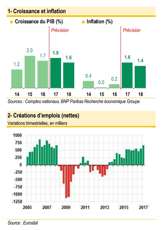 Elle est à mettre en lien avec le redressement de la confiance qui résulte, pour une large part, de l’amélioration des perspectives d’emploi. Alors qu’elle avait largement profité, depuis fin 2014, de la baisse des prix de l’énergie – celle-ci apportant un soutien décisif à la consommation des ménages – la croissance économique s’est donc poursuivie, et même renforcée, à partir de mi-2016, malgré leur remontée. C’est désormais l’emploi qui alimente le revenu et la consommation des ménages. L’autre caractéristique de cette phase de reprise est l’accélération de l’investissement. Après une modeste hausse entre le T2 2013 et le T2 2015 (4,7%) – insuffisante pour relever le taux d’investissement (la part de l’investissement dans le PIB) – la croissance de l’investissement a atteint 8,5% depuis mi-2015.