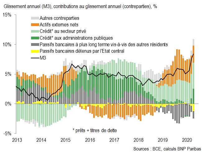 Si le crédit au secteur privé reste de très loin la première contrepartie de M3, le crédit aux administrations publiques a le plus fortement contribué à l’accélération de la masse monétaire depuis le début de l’année 2020, sous l’influence notamment de l’intensification de son programme d’achat de titres souverains par l’Eurosystème (67 milliards d’achats cumulés en mars et en avril 2020). En dépit de cette forte croissance de la masse monétaire, l’estimation préliminaire publiée par Eurostat suggère un nouveau recul de l’inflation de la zone euro en mai 2020 (+0,1%, son plus faible niveau depuis juin 2016) sous l’effet des mesures de confinement et de l’effondrement des prix de l’énergie.