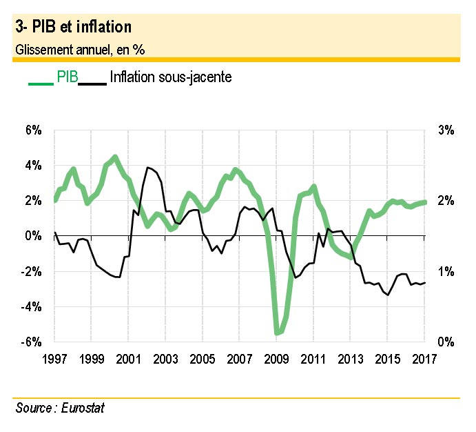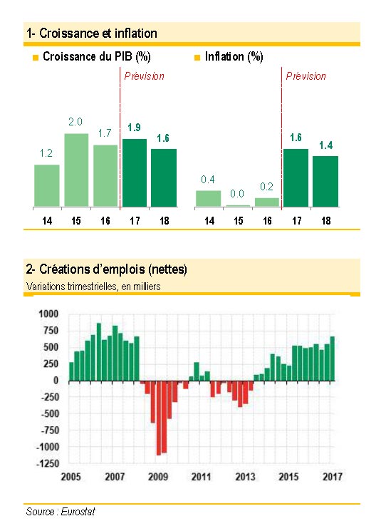 Même si les économies les plus dynamiques restent l’Espagne (+0,8%) et l’Allemagne (+0,6%) cela confirme une des tendances marquantes de cette reprise, à savoir une meilleure synchronisation des performances économiques au sein de l’Union économique et monétaire. Plus dynamique, la croissance de l’activité est aussi plus robuste, c’est-à-dire plus auto-entretenue, se distinguant ainsi, qualitativement, de la phase de rebond qui a fait suite à la récession, à partir de mi-2013.
