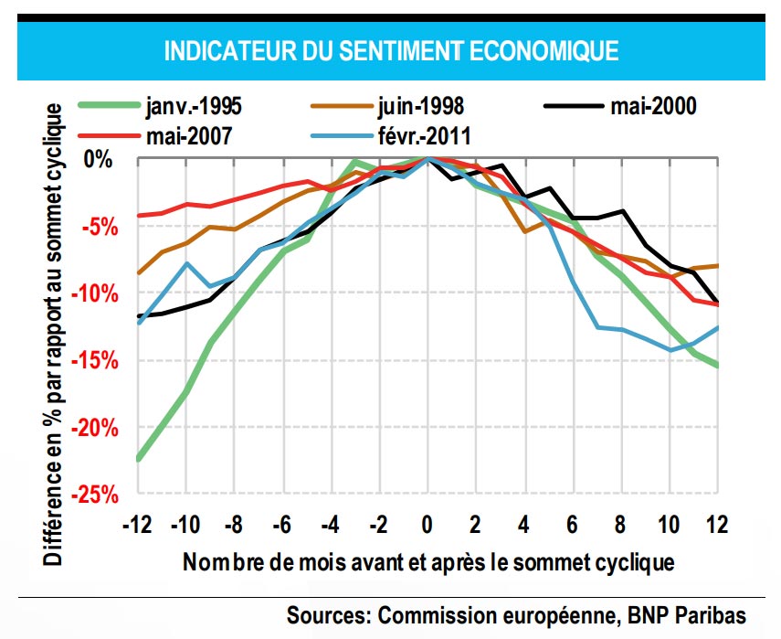 Sur le fondement de ces considérations, les perspectives pour 2018 apparaissent favorables. Cependant, conscient de l’éventail des risques et des incertitudes, un décisionnaire prudent pourra se demander ce que réservera le retournement de cycle. Le graphique montre qu’après avoir atteint un sommet, l’ESI cède entre 8 % et 15 % dans les 12 mois qui suivent. Cette fourchette est large, et les simulations fondées sur la relation statistique, certes loin d’être parfaite, entre l’ESI et le PIB aboutissent à des résultats allant du simple retour au taux de croissance potentiel à l’absence totale de croissance. On comprend mieux ainsi comment des données en baisse – au-delà de traduire – viennent alimenter le regain d’incertitude.